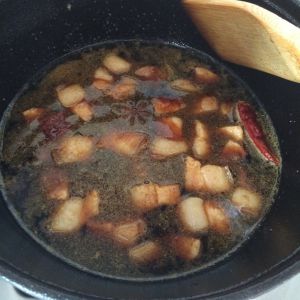 等到油多一些可以流动时加入其它肉块翻炒。等到肉表面全部变色时一部分一部分加入冰糖碎。翻炒至肉表面沾上焦糖。加入葱姜八角翻炒。