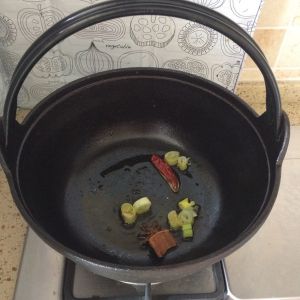 铁锅放油小火,放入葱和大料,翻炒过后加白糖至完全融化