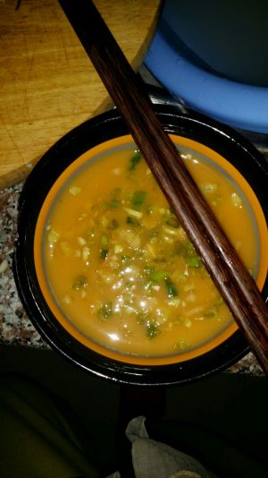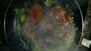 锅里留些许油,放入切好的香菜、姜蒜炒香。再放入番茄酱,不用太多。炒两分钟后倒入那碗调好的汁,煮至浓稠便可关火。