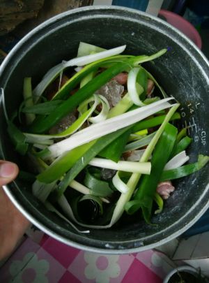 上面再放上小香葱,基本就是这样,然后电饭锅调成煮饭模式,开锅后调成保温,保温两个小时。
