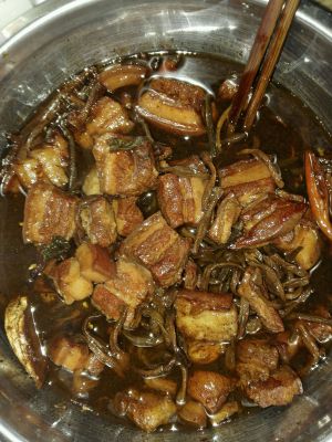 把五花肉和黑木耳一起放入高压锅,十五分钟。同时放入酒,姜片,酱油。不放水。