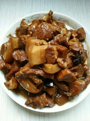 锅中放姜 八角 香叶 五花肉 炒至肉出油发黄 加入1比1的料酒和水 水盖过肉多 大火煮半小时 过程中加水