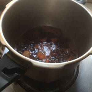 将㶽里多余的油倒掉,然后倒入开好的红烧肉调料和料酒,大火烧开。烧开后倒入高压锅内炖,酱料要刚没过五花肉。
