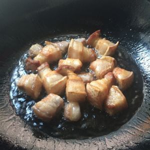 倒入少量油,放入冰糖,直到冰糖冒白泡后放入备好的五花肉炒糖色!