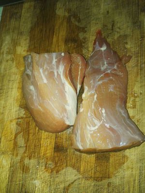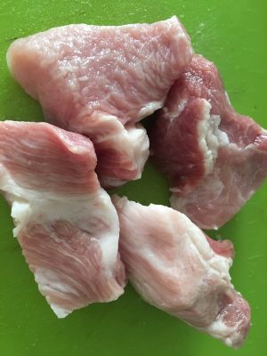 选择梅条肉因为它够嫩,即使烤出来也很嫩,比里脊肉好,梅条肉切大块用牙签戳遍