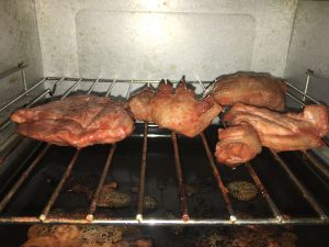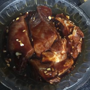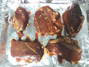 烤箱预热,肉摆在烤盘上,入烤箱,210度上下火,每10多分钟拿出来刷腌制的汁(汁里面又加了点蜂蜜)翻面,再刷汁……我不记得拿出来几次了,反正熟了就好