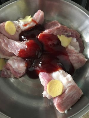 用叉烧酱和姜片腌制,用牙签在肉上撮小孔,让肉能入味点,撮完再用手按摩一下