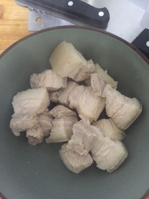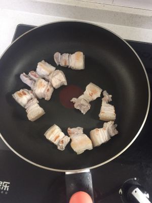再起一锅,小火不用加油,煎一下肉至两面金黄,去除一点肥油,这样吃起来不会很腻