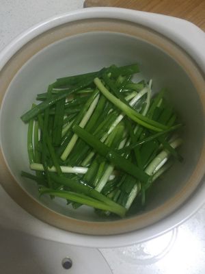 水快干的时候,加一点盐,鸡精,胡椒,再放一点青椒丝儿,再加点水继续煮15分钟的样子,同时调芡粉,10分钟后把芡粉倒入锅里,煮3分钟,出锅,撒葱花。