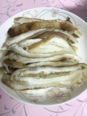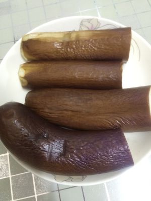 将蒸熟的茄子手撕成入图所示,撕的细条容易入味
