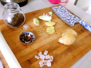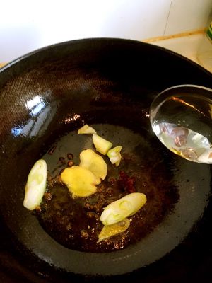 锅内放少许油,葱、姜、花椒、八角、桂皮、香叶爆锅。