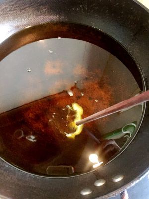 烧油,少量即可,炒至调料香气四溢,烹入酱油,加水,烧开