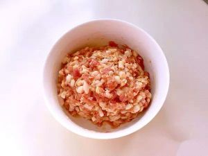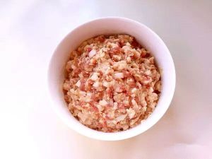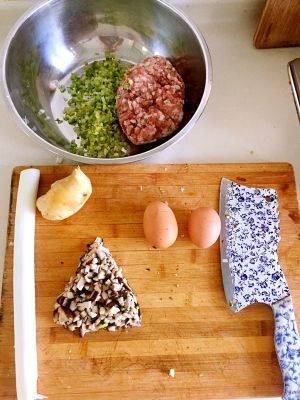 葱姜切末,香菇焯水后,也切碎,秘诀是先放葱姜沫,拌匀后再放香菇,给肉馅一首歌的时间融会贯通。
