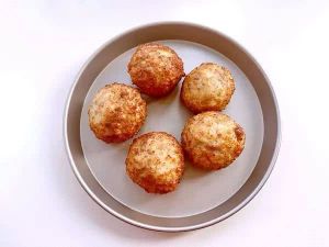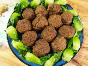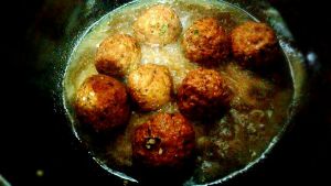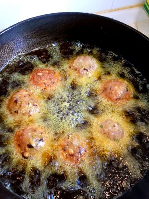 热锅下油烧至六、七成热,把肉馅团成50克左右的肉球,放入热油中炸至金黄控油捞出备用。
