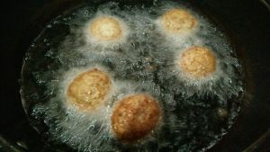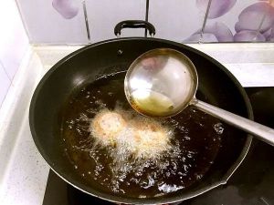 中大火炸至丸子外壳定型变硬,用勺子不断淋其顶部。