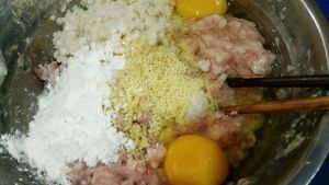 再加入葱姜末、馒头渣、淀粉搅拌均匀。