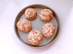 用手抓一把肉馅儿,团成大丸子,在左右手里来回倒上几十次后团成圆形;我做了五个,个头相当的大。也可以做小一点儿,这样也容易成熟。