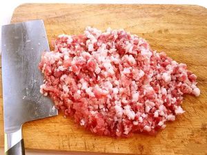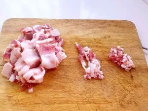 去皮五花肉先切片,再切丝,然后切成粒状。