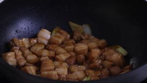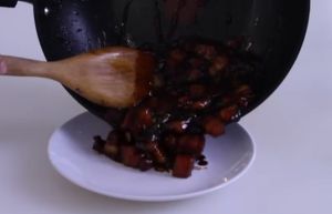 加入少量老抽上色,改大火收汁,待酱汁包裹在肉上,装盘即可。