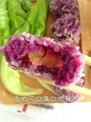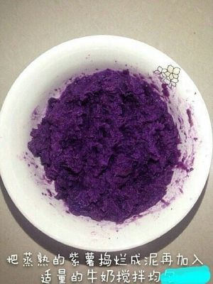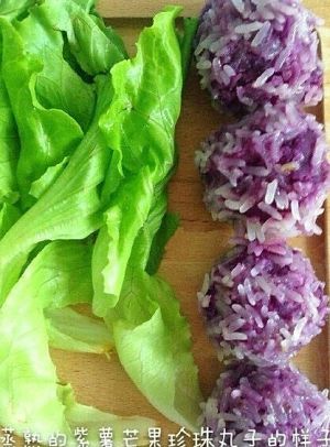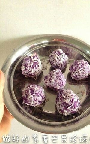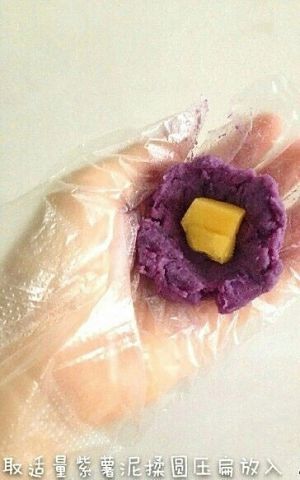 取适量的紫薯泥搓球压扁放一块芒果揉圆