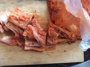 泡菜切块,我的泡菜是超市买的,选泡的时间久点的,比较入味,可以让超市阿姨给你挖点汤,很入味阿。