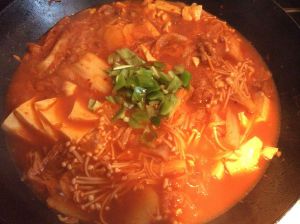 热锅凉油,放五花肉炒至出油,加入泡菜翻炒。加水,加配菜,加辣酱,注意:金针菇最后出锅前2分钟放,这个烧久了不好吃。