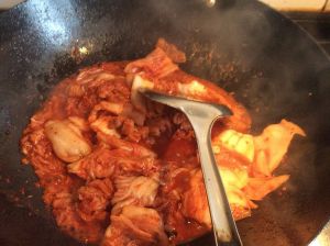 Stp2 把腌制好的泡菜(我是超市买回来的韩国泡菜金吉顺,很好吃,建议大家也选平时喜欢吃的泡菜做汤)切好放入锅内,再倒入一些腌汁,然后加入豆腐