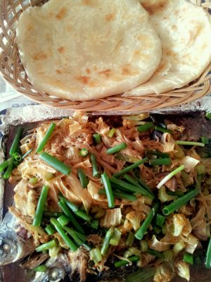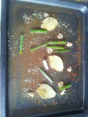 锅中放少许油,煸剩下的蒜片和姜片至金黄色,加入豆瓣酱煸炒,炒出红油加适量水或高汤,根据自己口味加孜然粉,辣椒粉,黑胡椒粉,少许糖,蒸鱼豉油,搅匀,由硬到软分别入食材炖煮,加盐翻炒,汤汁可以多留一些,关火。没有烤箱的煎完鱼就在这锅料里炖煮鱼,快熟了再放入其他食材,也很好吃。