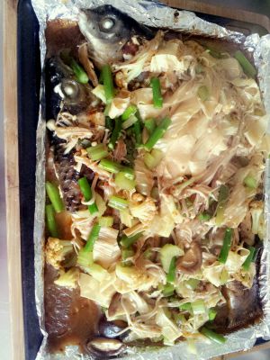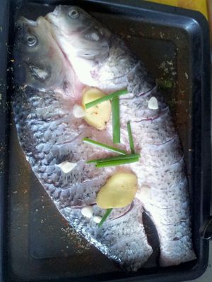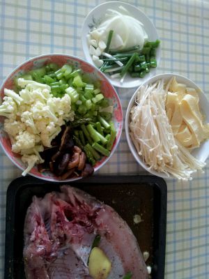 剪去鱼鳍(头部附近的最好剪掉,因为做鱼头汤前需要炸制,鱼鳍容易炸焦),将鱼头切下煮汤(因为买的鱼太大,切鱼头的时候连带的鱼肉多些,要不烤盘中实在放不下)。