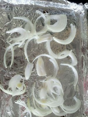 烤盘放锡纸,涂一层食用油,白洋葱切丝垫底。