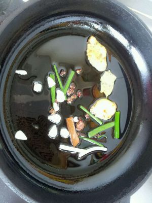 烤箱220度预热。鱼稍微控干(不然容易崩油)铁锅放油,可稍多不然容易粘锅,放入刚刚腌制料里的蒜片,葱段,姜片,再加入花椒,大料,桂皮,香叶,煸香,放入鱼,两面煎至稍微变黄,皮脆。