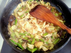 其他食材清洗。香芹,芦笋切段,菜花掰小块,香菇切两半,豆皮切宽段,金针菇去根撕开。其他自己喜欢的食材都可以放哈(*ˉ︶ˉ*)剩下的小葱切段,姜切片,蒜切片,小青尖椒切粒,香菜备用。