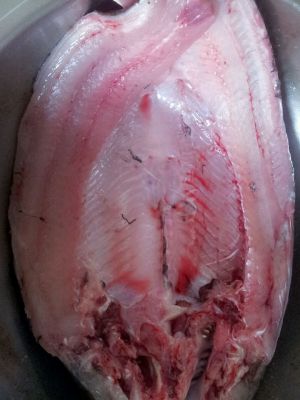 沿着鱼脊将鱼破成两半,鱼头也可对面剖开(均避开中间最硬的部分,可菜刀剪刀相互配合着用),便于煎熟。