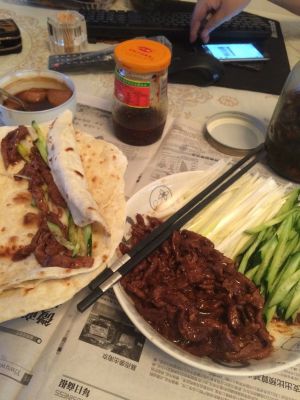 饼烙好,洗锅热锅温油,放入腌制好的肉丝快速滑至变色,盛出。利用底油炒香甜面酱,接着加入肉丝翻炒,让酱汁均匀地裹在肉丝上即可。用饼卷上少许京葱,加上肉丝也可以加点黄瓜。美味的卷饼就好啦!