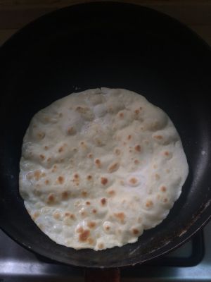饼鼓起有气泡就可以了。这时候准备甜面酱,酱里加入一勺糖和少许香油搅匀。