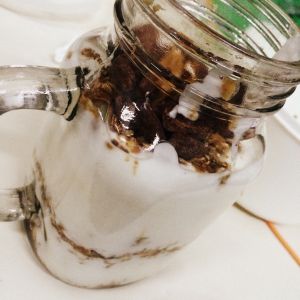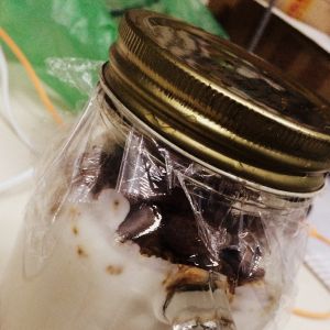 最顶层加了燕麦和蜂蜜之后加一勺花生酱。我还加了点谷维滋。盖上保鲜膜再盖盖儿就完成啦。放冰箱一晚 再放妥妥的健康。我住宿舍没有冰箱。现在天比较凉就放窗外