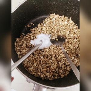 加一小勺椰子油。会有椰子香气。我这边北方。这个时候椰子油已经凝固。放入锅中继续翻炒一分钟关火。燕麦片脆脆甜甜的。有红糖的味道。如果喜欢红糖味。那么少量的红糖必不可少。不喜欢则去掉。