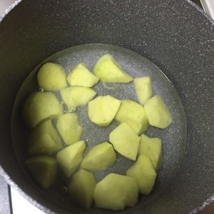 土豆去皮,加少量水煮熟。切小熟的快,要用不粘锅,不然容易糊底。然后捣成土豆泥。