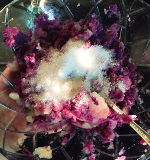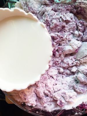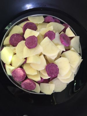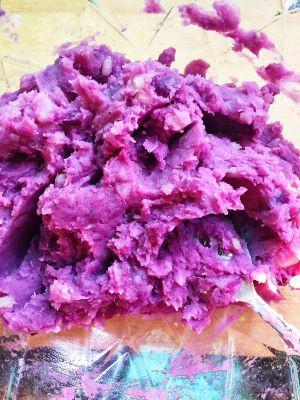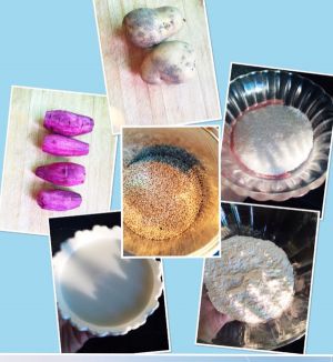 准备图中6⃣️种食材:紫薯,土豆,糯米粉,牛奶,白芝麻,白糖。