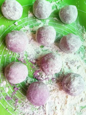 再用手掌压团子。如果粘手,表面撒点面粉就OK……