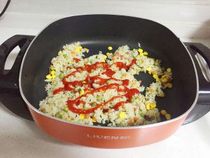 橄榄油热油倒入一个蛋量,打碎,放入准备好的各种肉菜碎粒,加入盐,翻炒一会儿放入米饭(就是炒米饭的方法)再加入番茄酱,炒匀,出锅前加入小葱花。