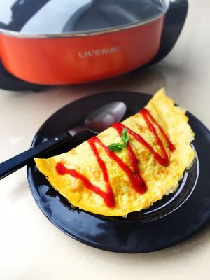 摊鸡蛋饼,蛋包饭的精髓就是蛋饼摊五分熟,这样既成型又比较嫩滑。(因为我家摊蛋锅比较小,有一份蛋包饭没有包住是盖上的[偷笑])
