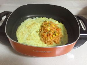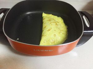蛋皮对折,边缘刷蛋液用勺子压着封边(速度要快,蛋液熟得快)