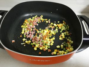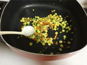 放入玉米、豌豆、胡萝卜翻炒片刻后,加入少许盐、十三香给蔬菜加些底味(小火)