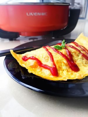 蛋饼盖在米饭上,倒入番茄酱就可以吃啦~~~~