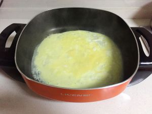 起热油锅中火,将鸡蛋浆液倒入锅中形圆形