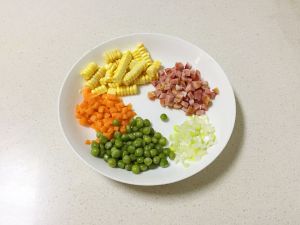 蒸米饭加入玉米粒,如果是玉米粒罐头可以不用蒸,留出备用即可。