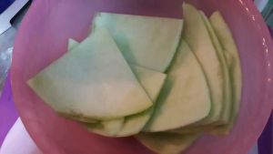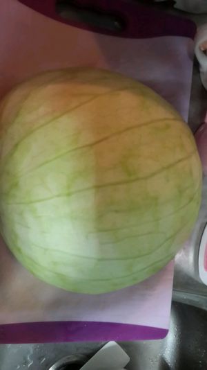 由于西瓜皮还比较厚,所以要把它切开一半,厚度适合。如果喜欢比较厚的,可以不切。