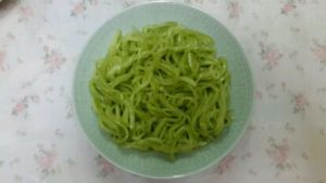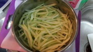 瓜皮洗净切条,将瓜皮的硬皮去掉,把未吃净的瓜瓤切掉,余下切成丝条