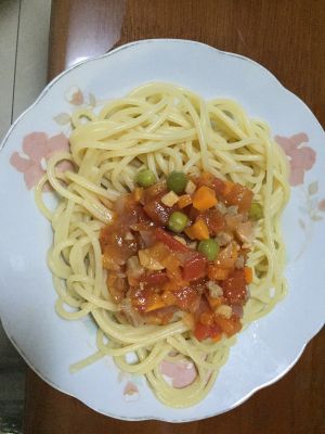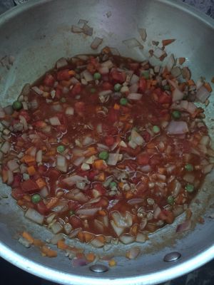 将西红柿、洋葱、青豆和意大利面酱倒入锅中,加入少许水炖煮。